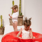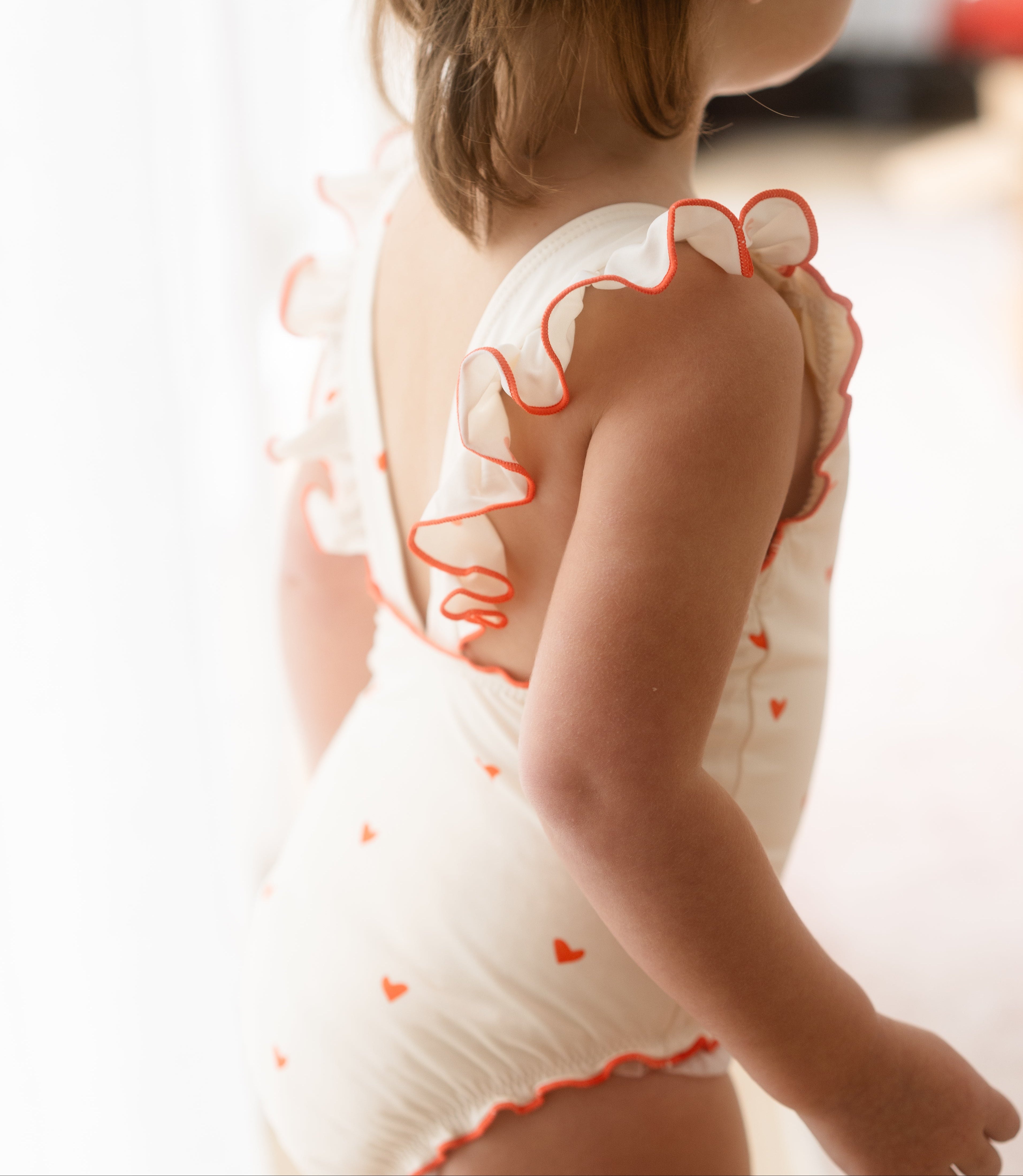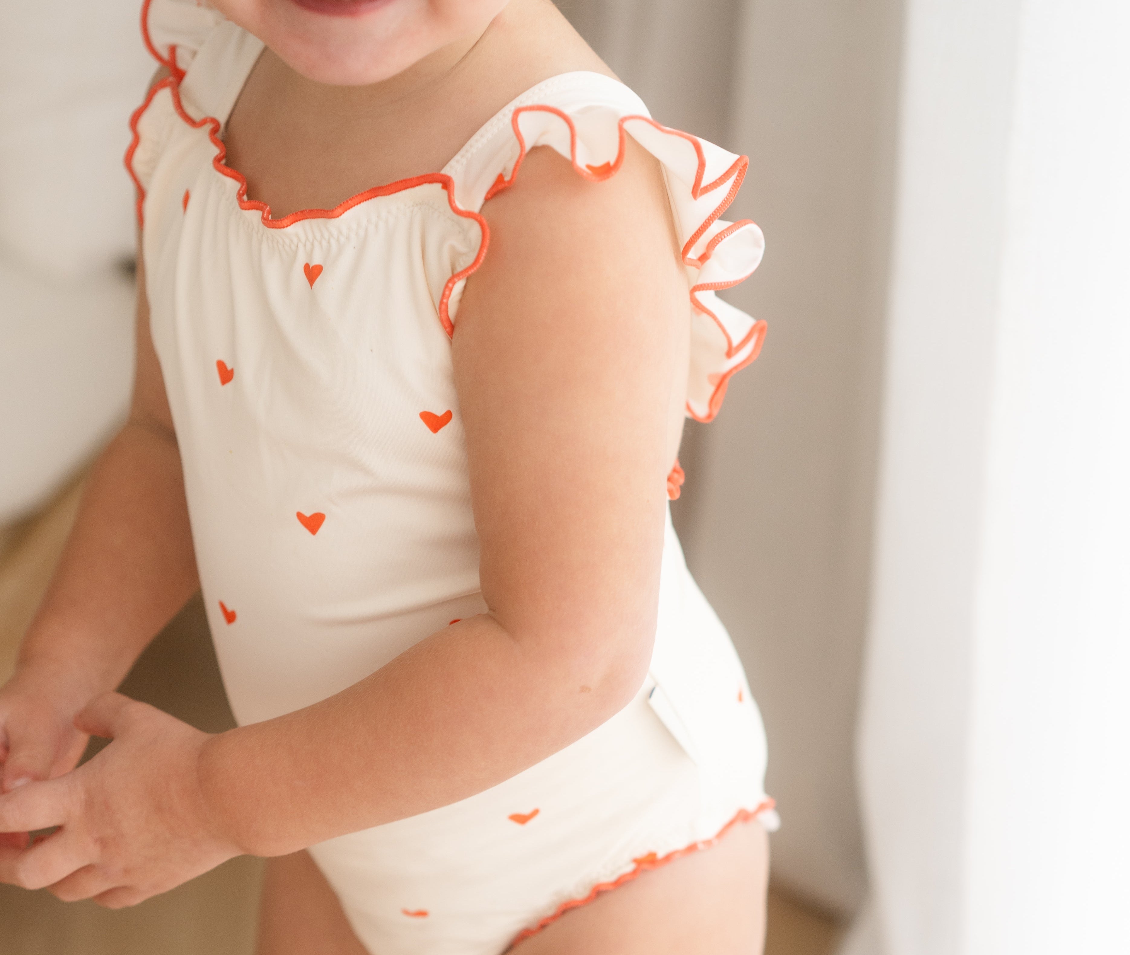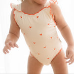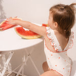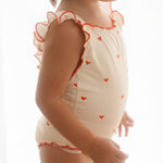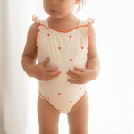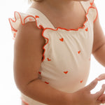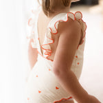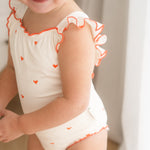 The sweetest apron-style one-piece. Creamy ivory is dotted with mini hearts, while fluttery frill straps and cherry-red lettuce edging add an extra touch of charm. With wide straps that sit softly on little shoulders, gentle gathers, and domes at the crotch for quick changes, this swimsuit is made for minis to move, play, and love their summer days.