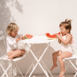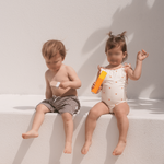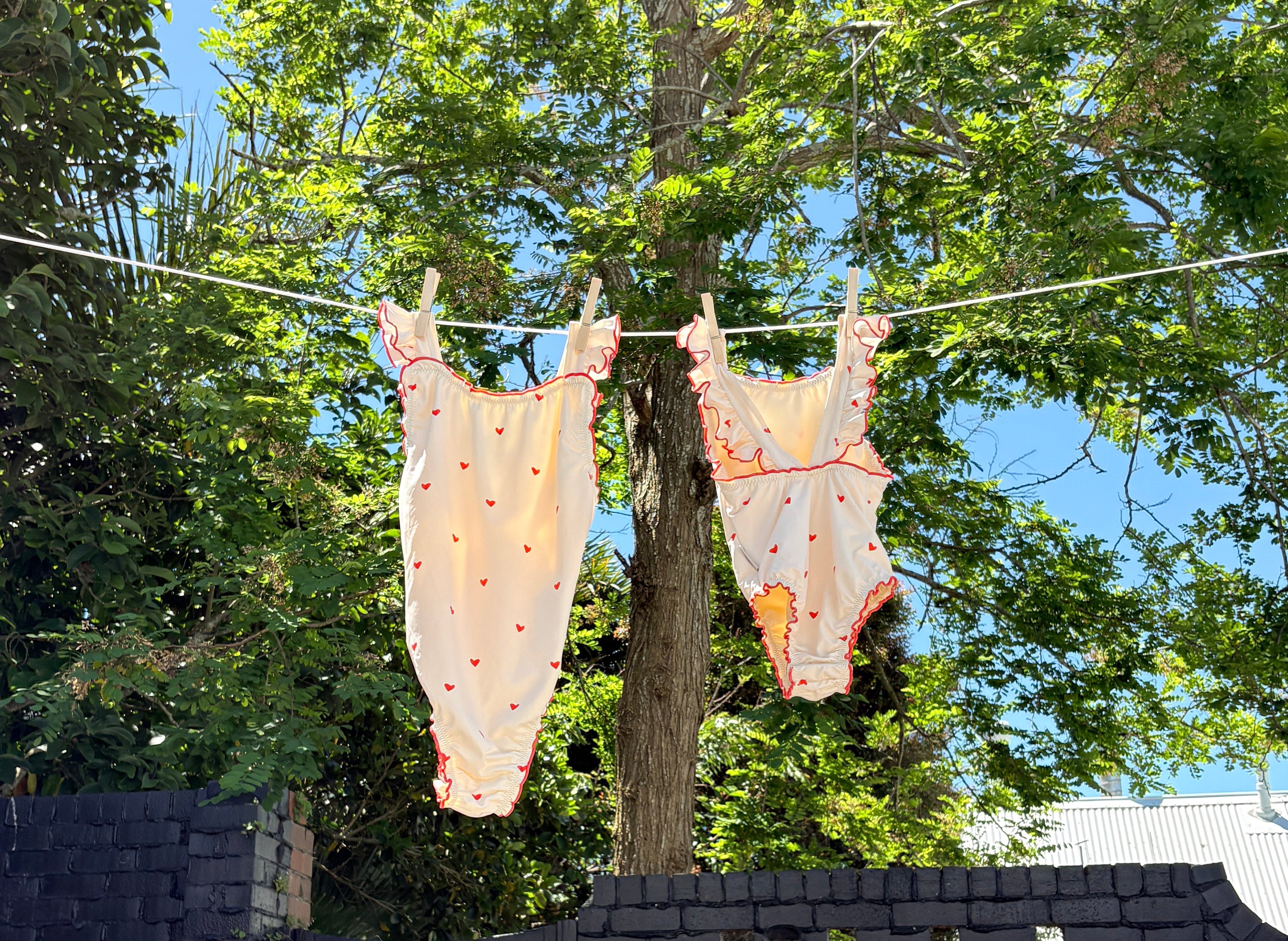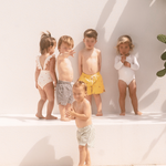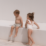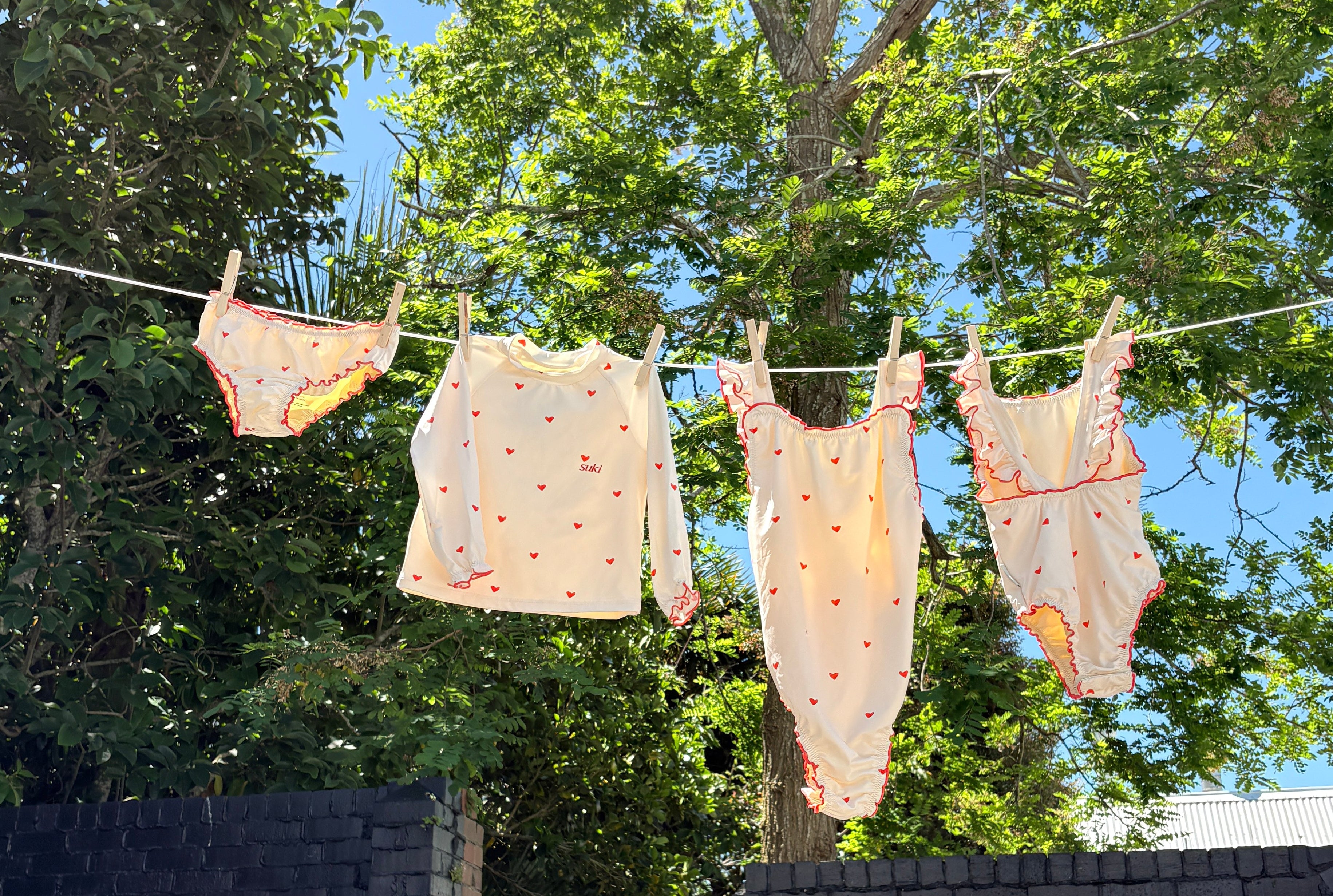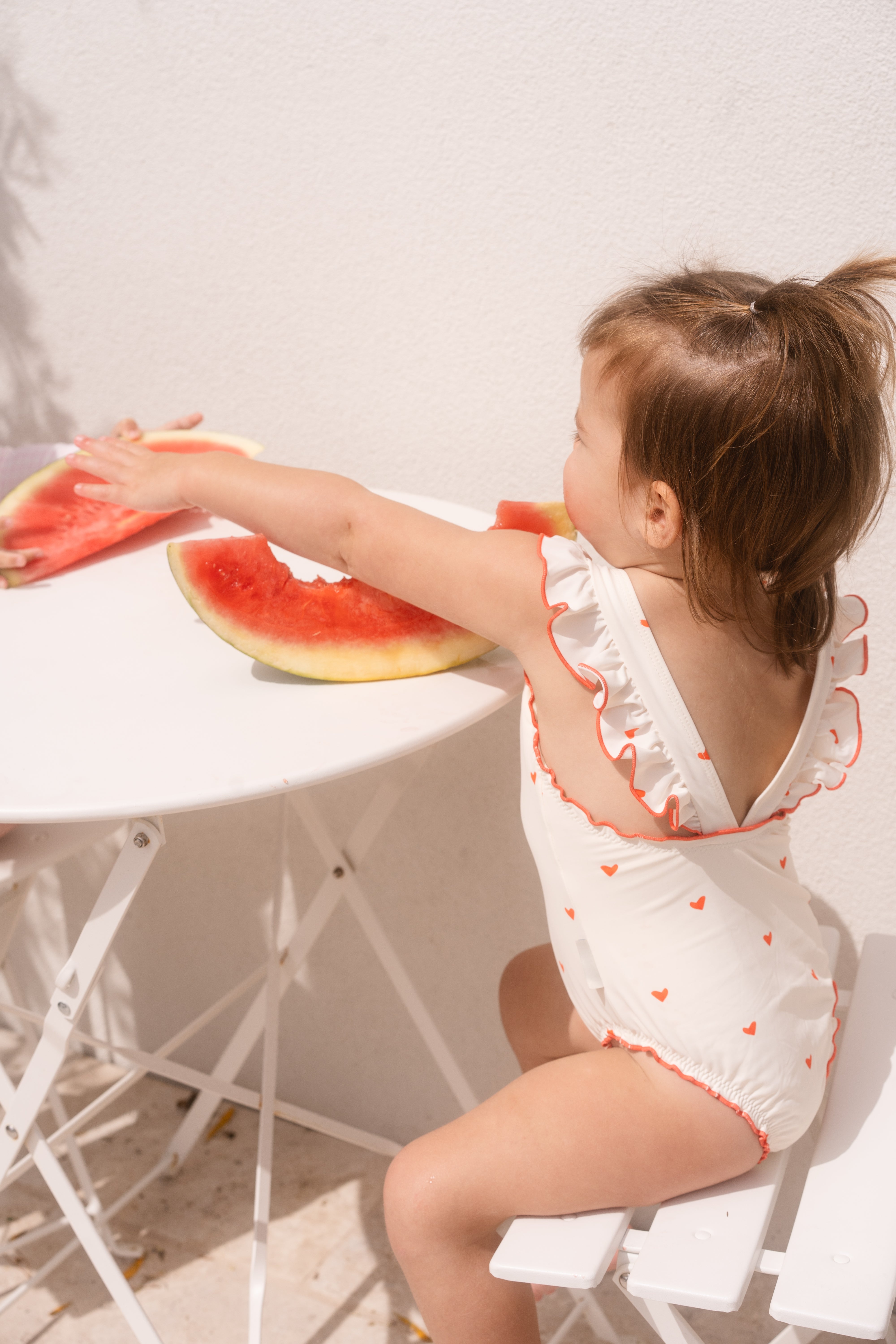 The sweetest apron-style one-piece. Creamy ivory is dotted with mini hearts, while fluttery frill straps and cherry-red lettuce edging add an extra touch of charm. With wide straps that sit softly on little shoulders, gentle gathers, and domes at the crotch for quick changes, this swimsuit is made for minis to move, play, and love their summer days.