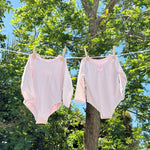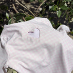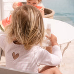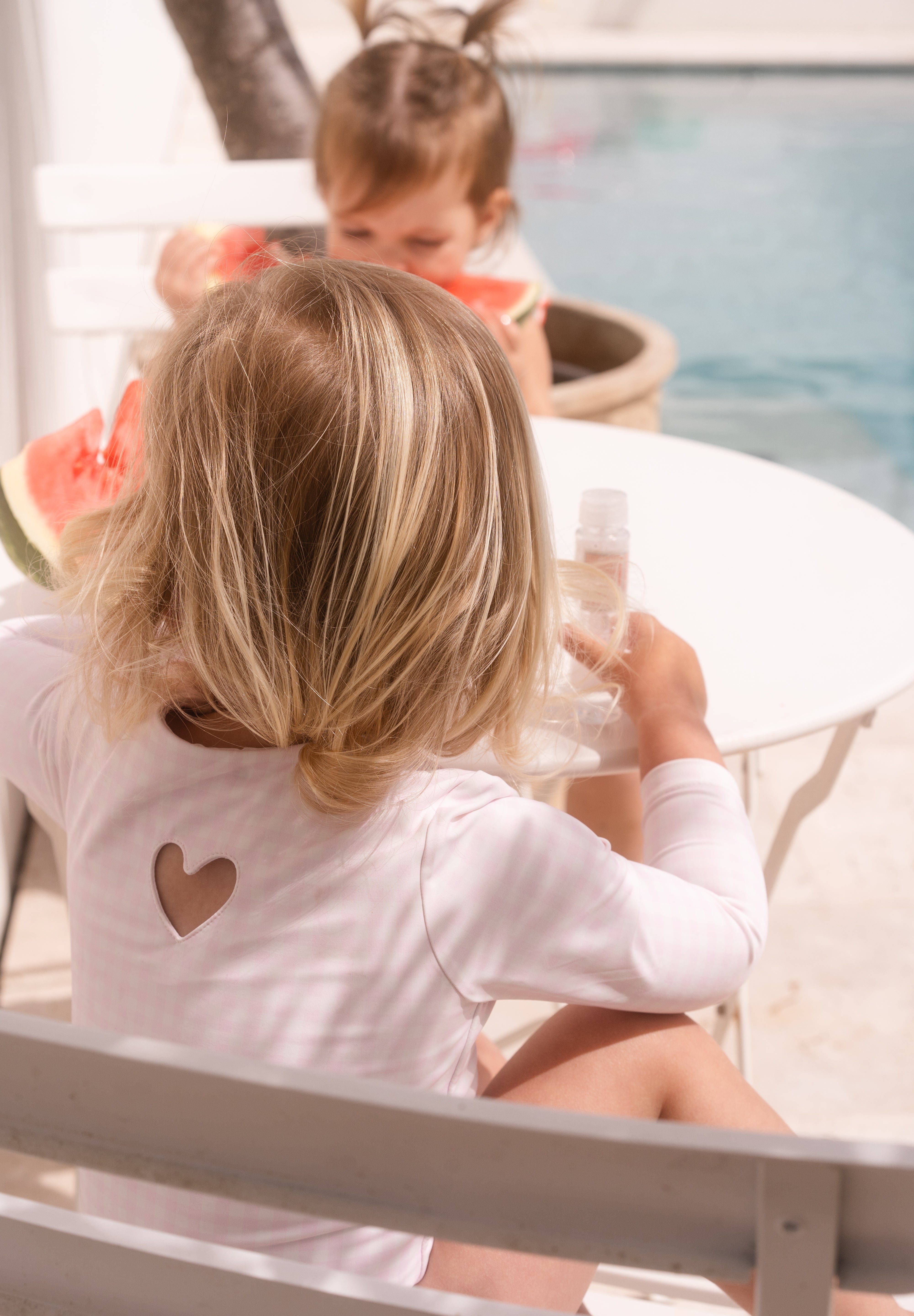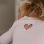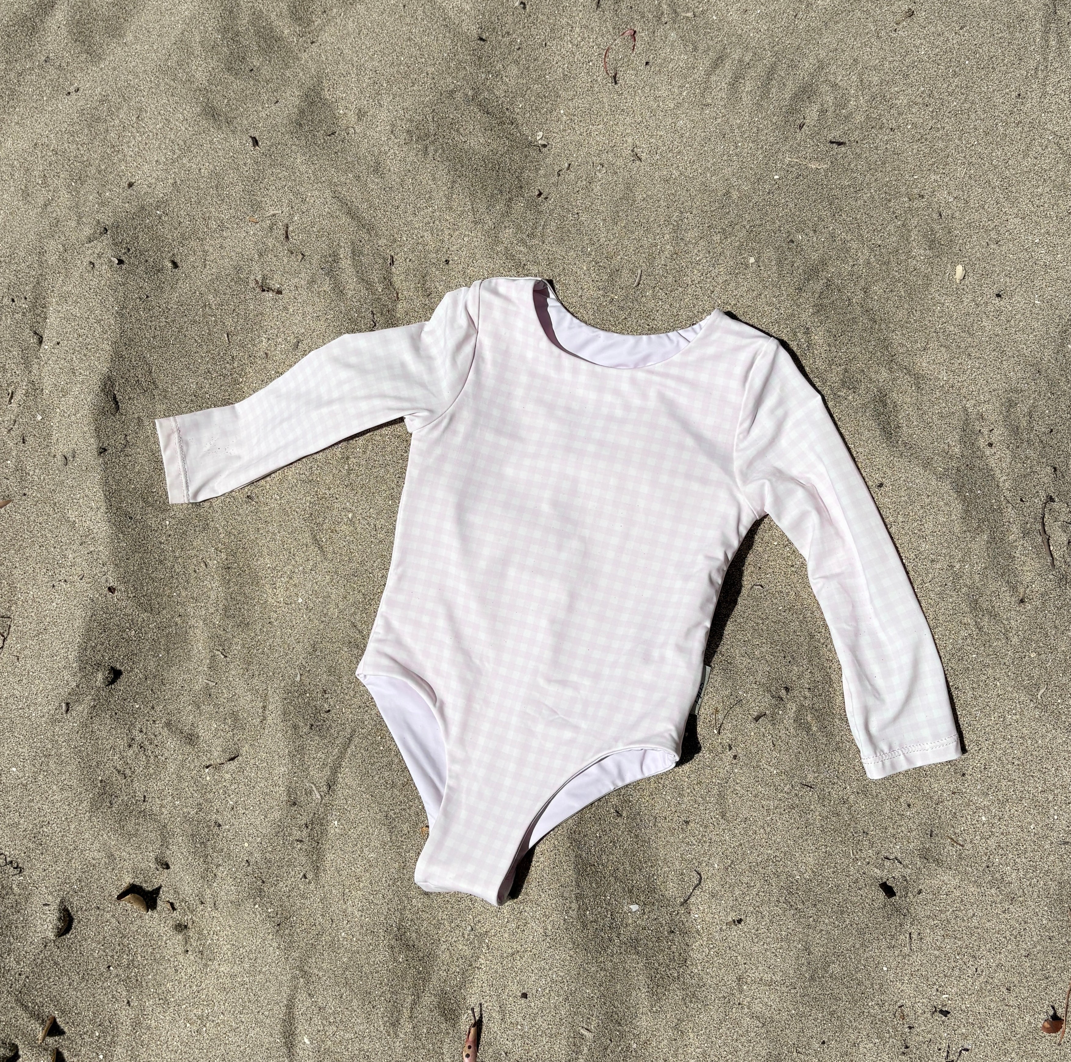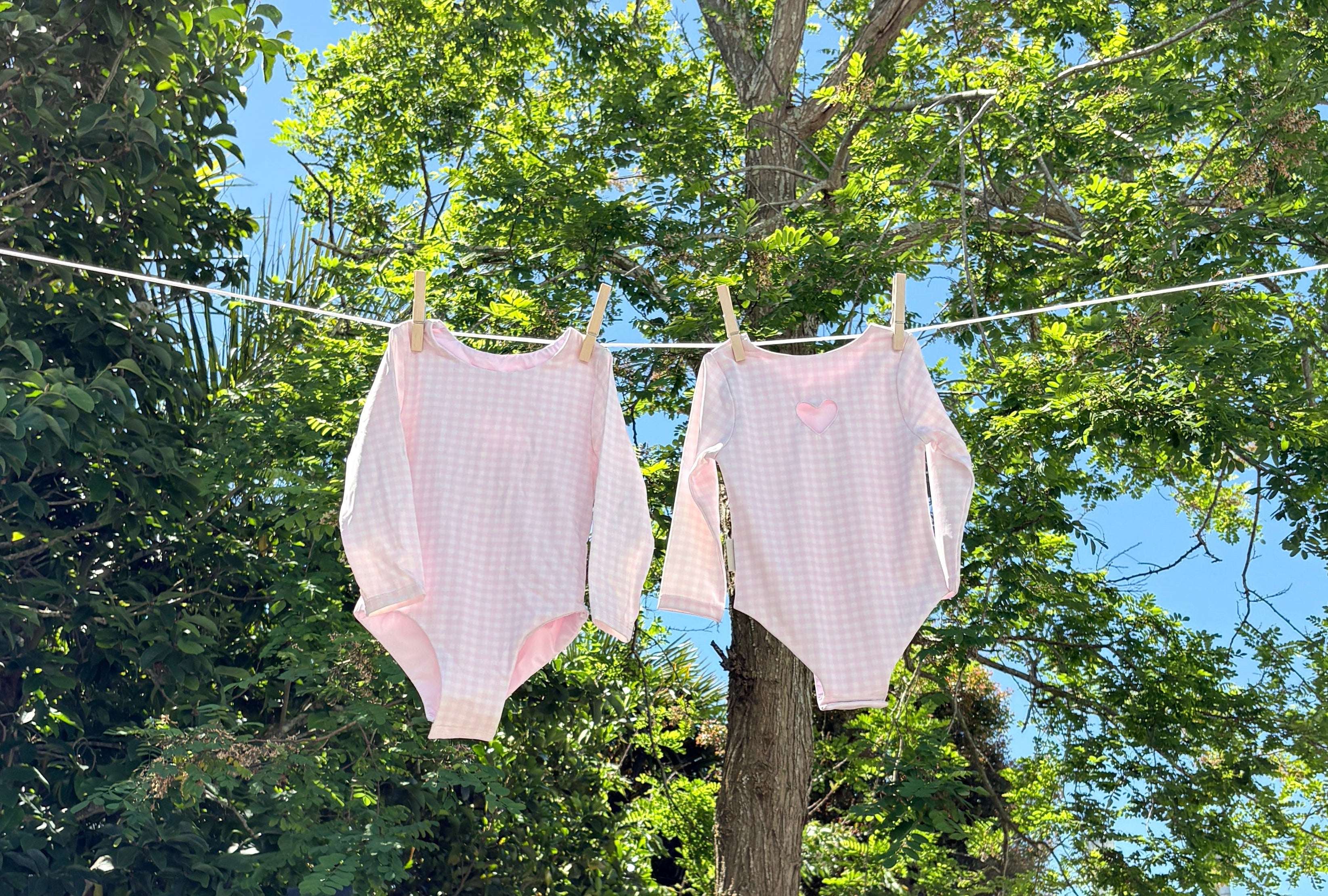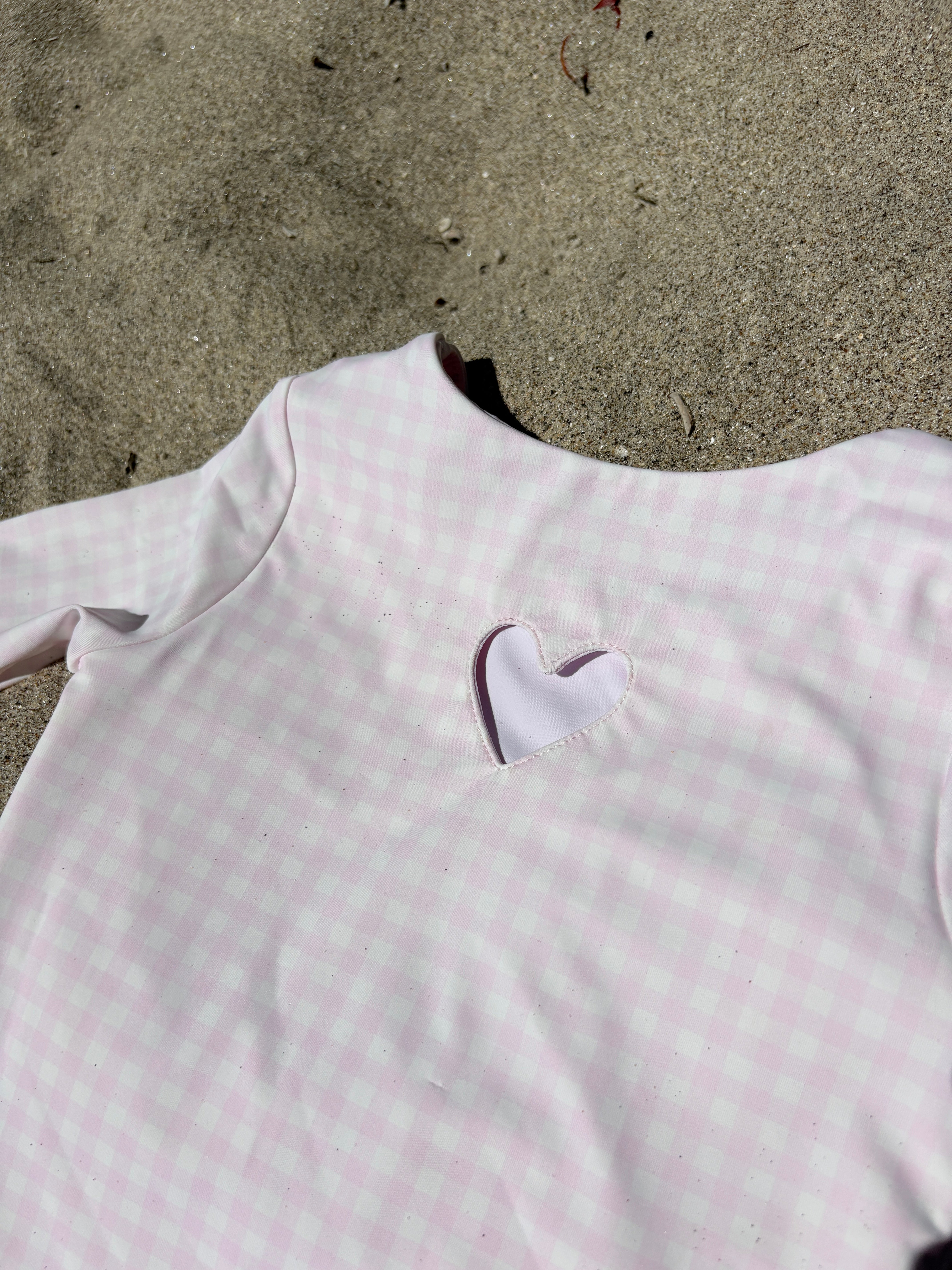 A heart-felt soft pink gingham one-piece with long sleeves. Designed for sun-safe play, it features full-length sleeves, a high neckline, and a heart-shaped cut-out on the back - a sweet surprise detail for summer days. Fully lined through the body for thoughtful coverage, and with snap domes at the crotch for easy changes, it’s as practical as it is pretty.