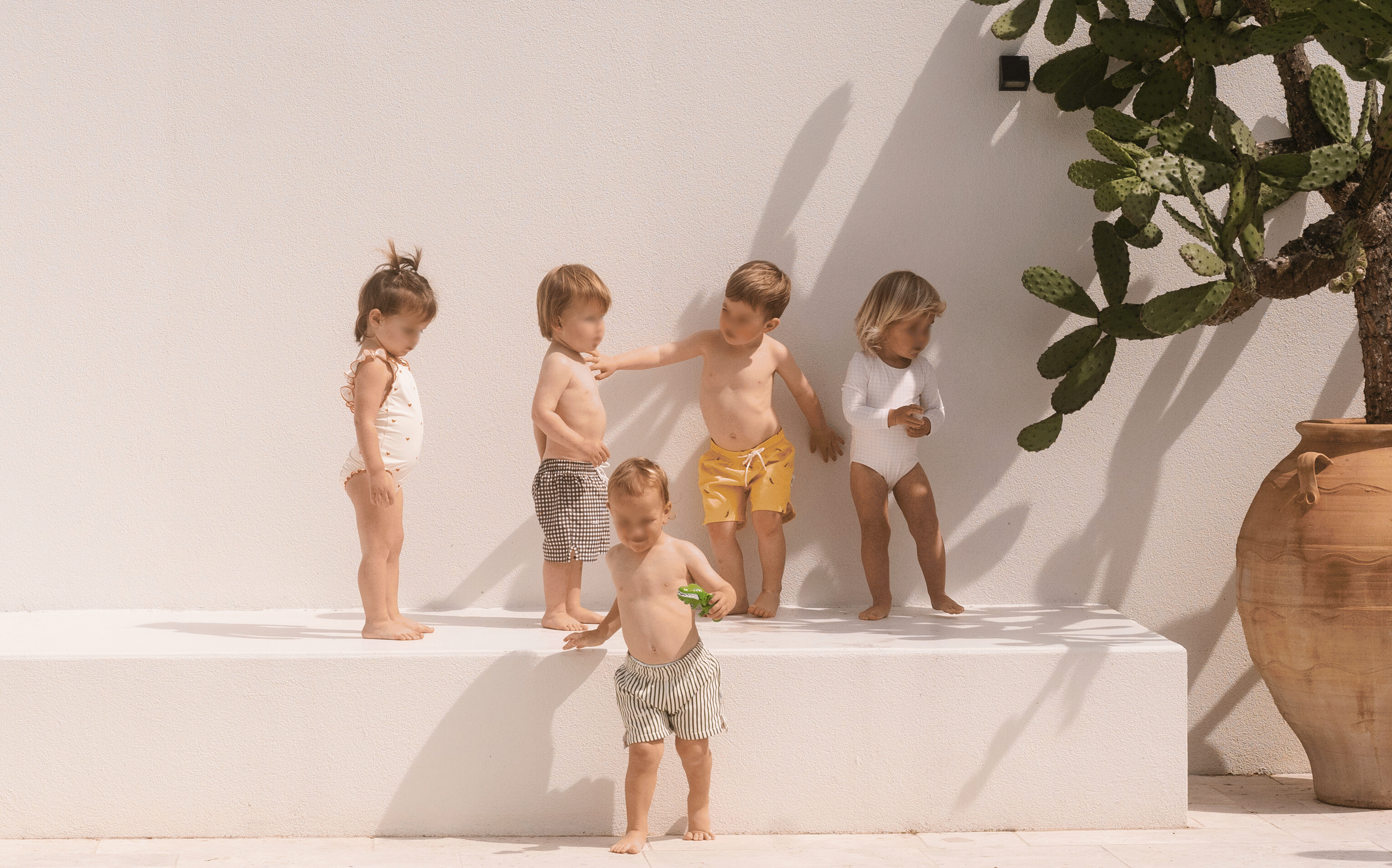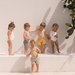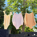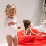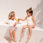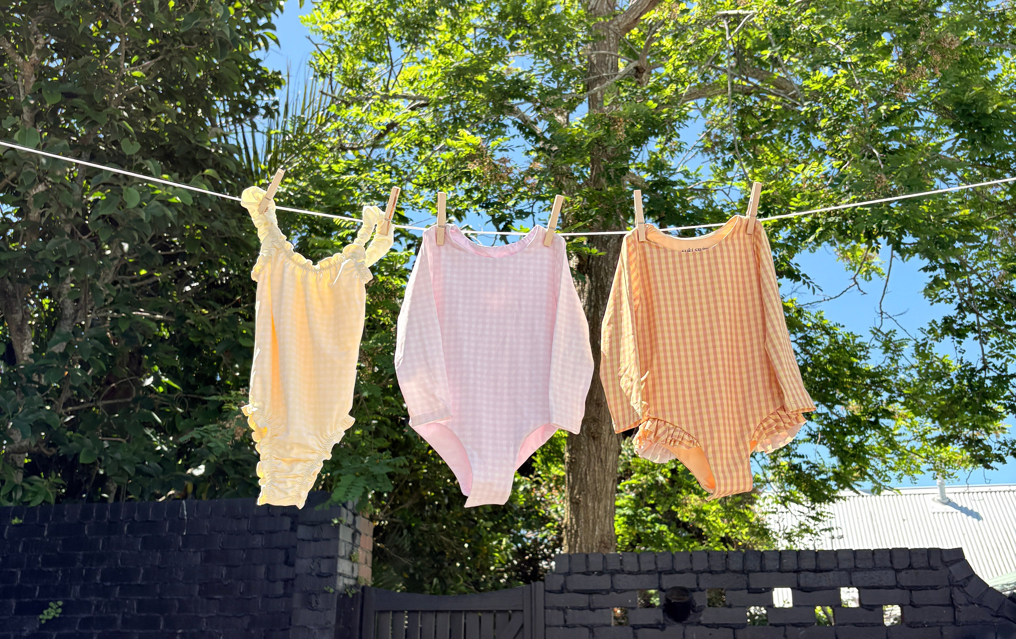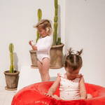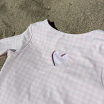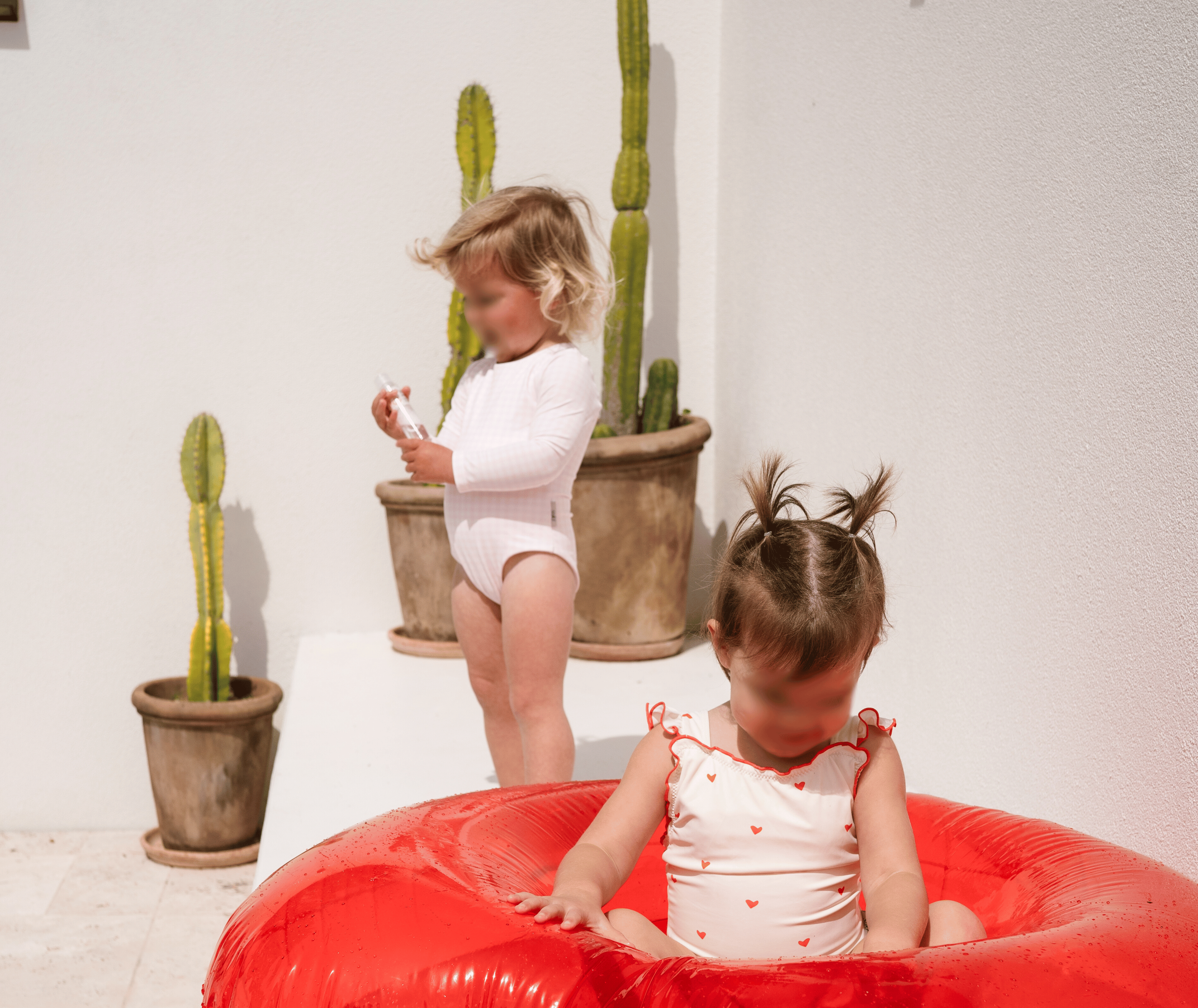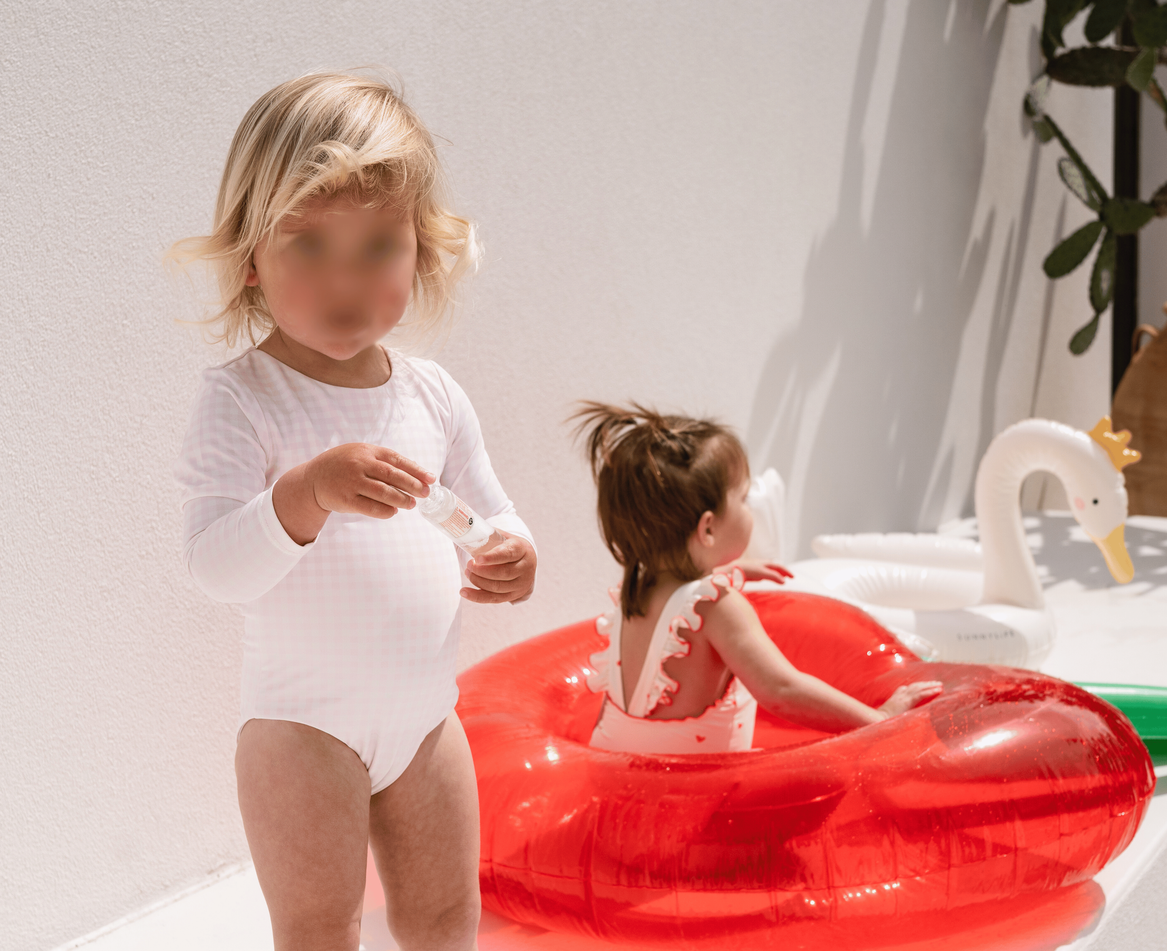 A heart-felt soft pink gingham one-piece with long sleeves. Designed for sun-safe play, it features full-length sleeves, a high neckline, and a heart-shaped cut-out on the back - a sweet surprise detail for summer days. Fully lined through the body for thoughtful coverage, and with snap domes at the crotch for easy changes, it’s as practical as it is pretty.