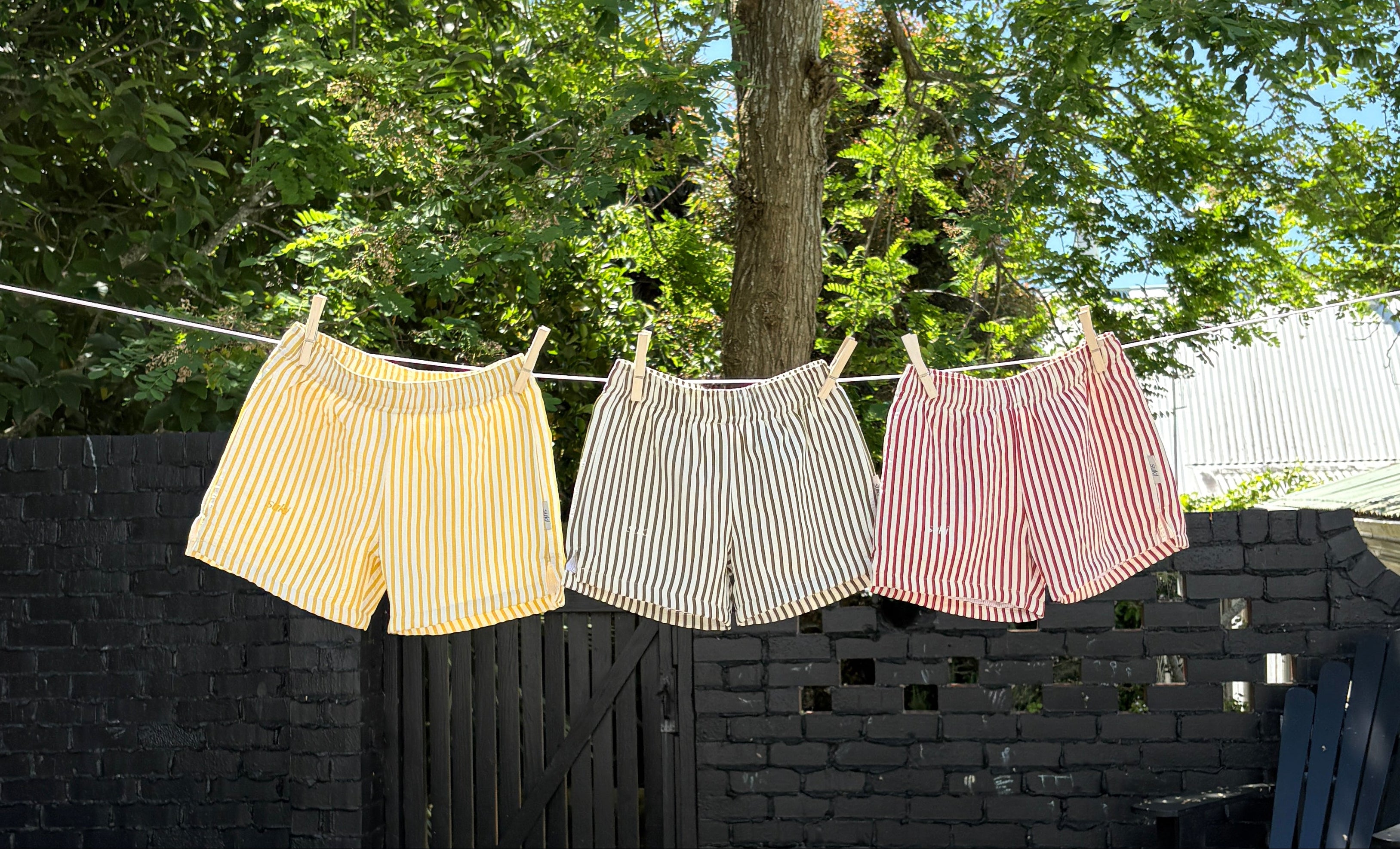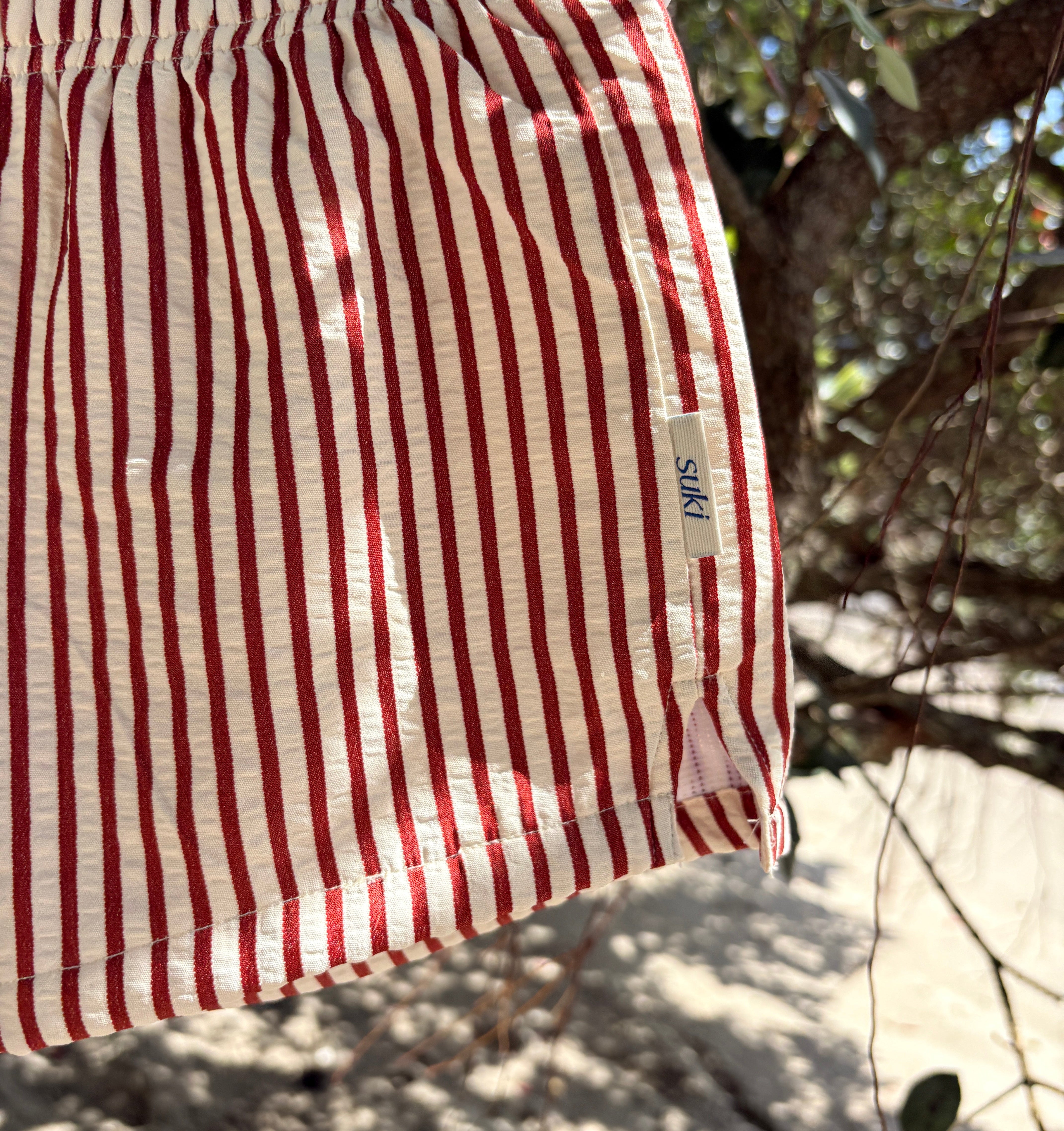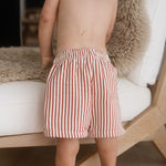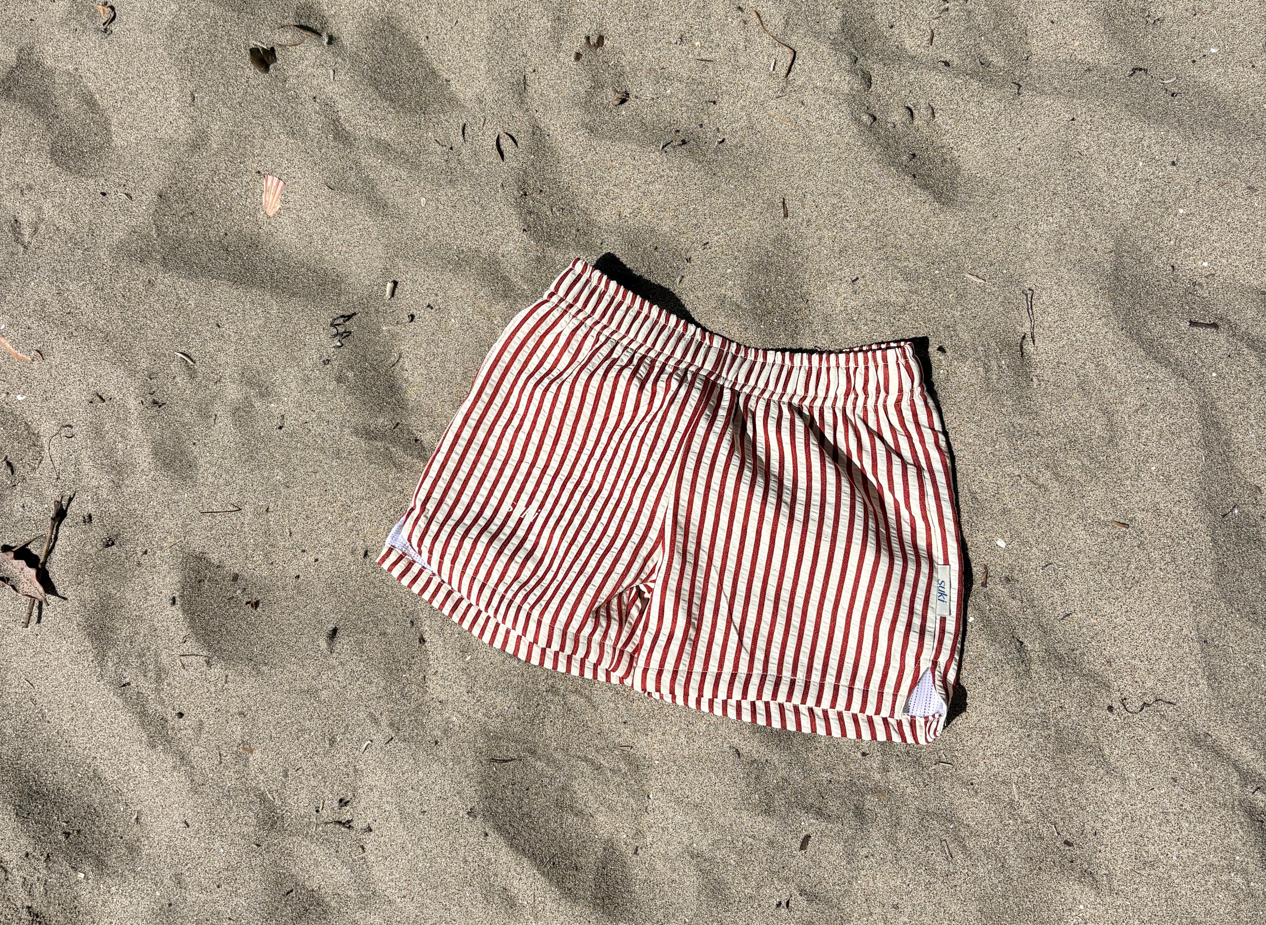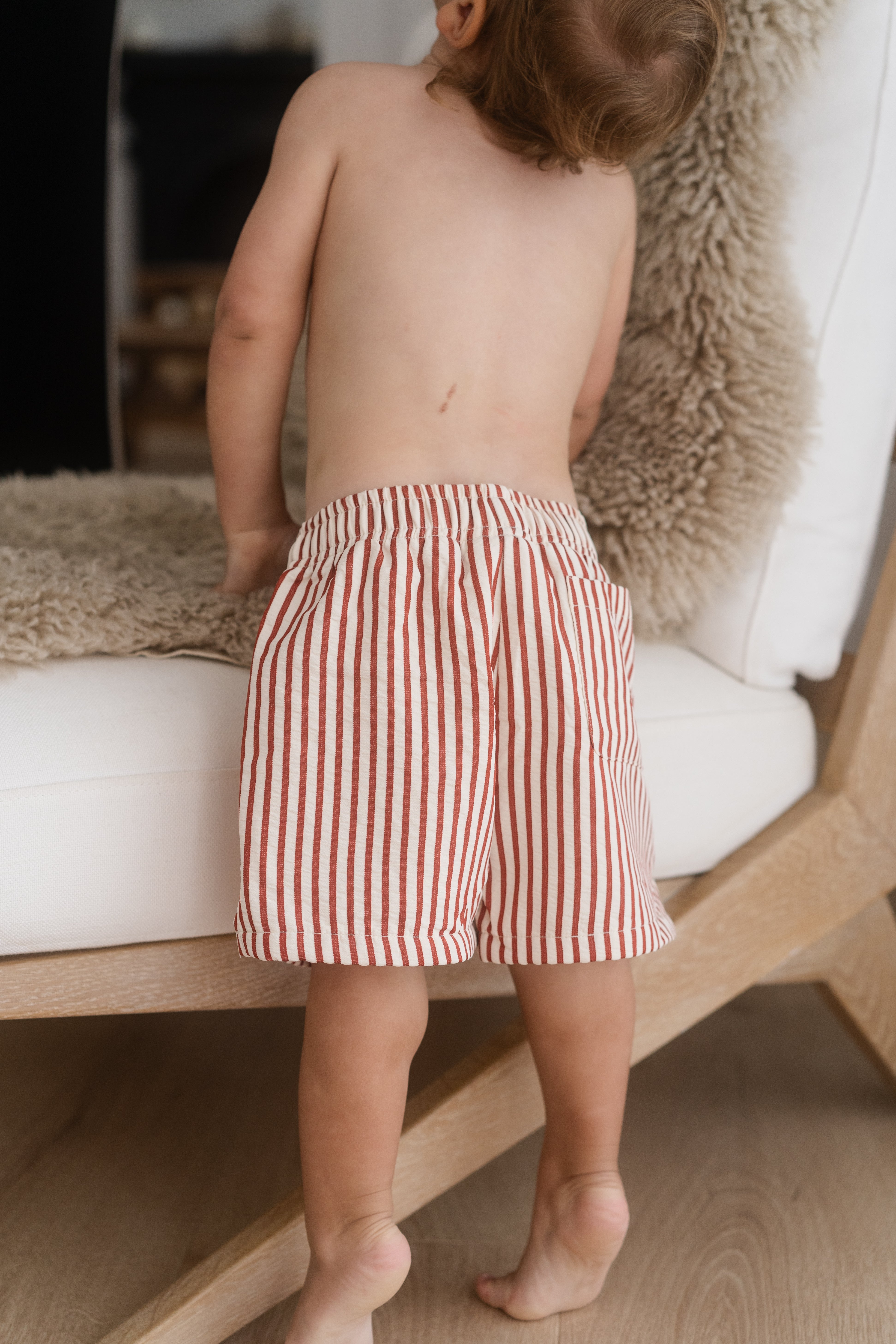 Sunny day stripes. Chilli Club brings warm rust and cream tones with an easy fit and elastic waist for all-day comfort. Fully lined, quick-drying, and made for beach adventures, messy ice creams, and bursts of energy in the sunshine.